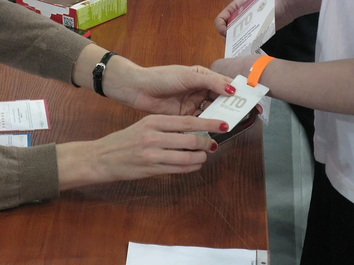 Процесс сдачи нормативов автоматизирован, но не до конца. Система простая: на входе в манеж каждому школьнику надевают персональный одноразовый браслет с чипом и выдают зачетную книжку. На определенной станции он выполняет тест, судья фиксирует результат, записывает его в зачетную книжку, заверяя своей подписью. Дальше участник идет к секретарю станции, который сравнивает результат в «зачетке» с возрастными нормативами, и в случае соответствия золотому/серебряному/бронзовому нормативу с помощью сканера записывает на его браслет эту информацию.