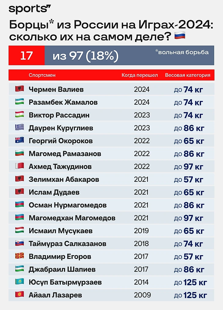Любопытно, что для многих борцов смена гражданства – бюрократическая формальность. Некоторые даже никуда не уезжают из России, продолжая тренировки на базах сборной: бахрейнец Ахмед Тажудинов выкладывает фотки с тренировок в спортшколе имени Абдулрашида Садулаева, узбек Разамбек Жамалов – с олимпийской базы в Кисловодске, болгарин Магомед Рамазанов и албанец Зелимхан Абакаров готовились к Играм в родном Дагестане, а, например, Айаалу Лазареву земляки-депутаты Якутии готовы платить пожизненную стипендию за медали, завоеванные для Киргизии.